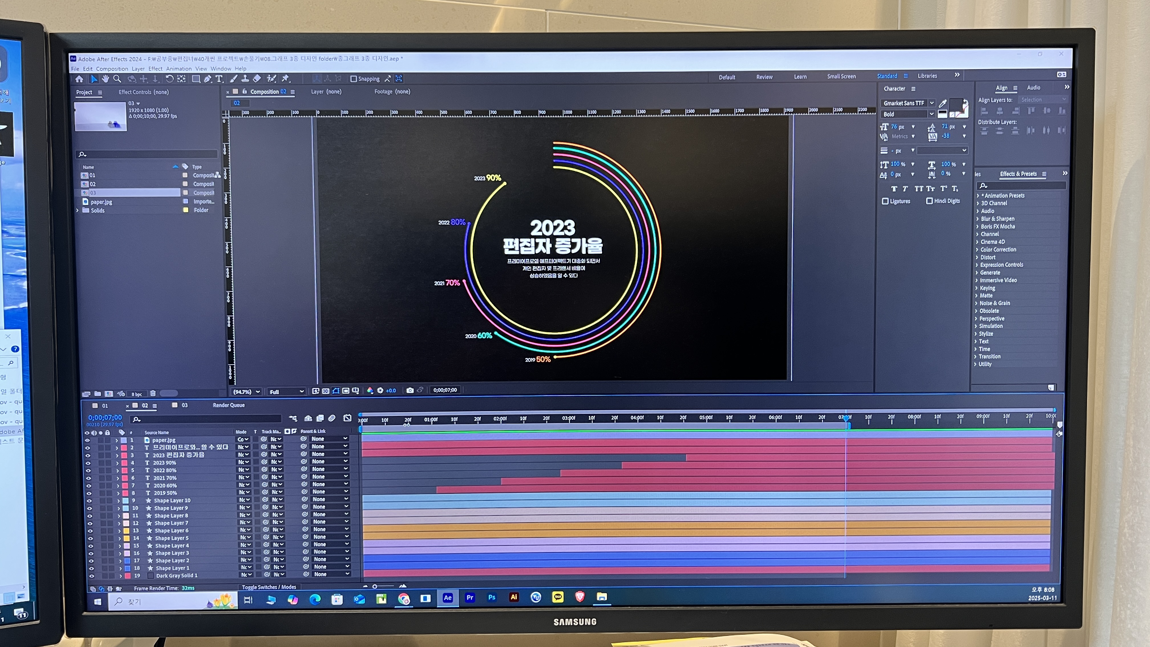 이번 챌린지로 내 컴퓨터에 40개의 씬을 저장할 수 있었다. 정말 너무 뿌듯하다. 특히 저런 그래프들은 방법을 알기는 하지만 귀찮아서 매번 만들때마다 좀 짜증이 나는데 이렇게 만들어 놓으면 급할때 레퍼런스 따로 찾아볼것이 아니라 복습하면서 다시 만들면서 이번에는 나만의 스타일로 재탄생 시키는 재미도 있을 것 같다는 생각이 들었다. 사실 저 그래프는 미션 중에는 만들지 않았던 손풀기 챕터 안에 있던 내용이 였다. 귀찮을 것 같아 만들지 않고 건너 뛰었는데 미션이 끝나고 마저 꼼꼼히 들으면서 만들었다. 역시나 편집녀의 화려한 색감과 그래프가 만나니 똑! 떨어지는 디자인을 구성해 내었다. 이런 그래프는 홍보 영상에서는 빠지지 않는 부분인데 세가지나 되는 그래프 모양을 알려주어 앞으로 그래프가 나온다면 귀찮아 하지 않고 영상을 다시 보면서 재구성 하는 재미에 쉽게 일이 끝날 것 같다는 생각이 들었다. 나중에 저런 모양을 Cinema4D로 만들어서 입체적으로 만들어도 좋을 것 같다는 생각을 하게 되었다. 다음에는 3D로만 구성된 씬에 대해서도 해 주셨으면 좋겠다. 요즘 Adobe가 Ai를 많이 도입해서 예전에는 어렵게 작업했던 것도 아주 쉽게 만드는 세상이 되어 이런 부분에서도 강의를 많이 만들어 주신다면 도움이 많이 될것 같다.(물론 지금도 많이 생기고 있지만 말이다.)