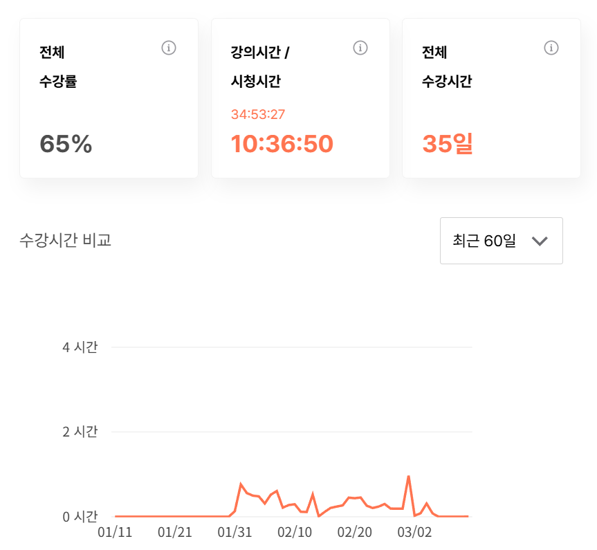 나는 경력자이다. 그래서 늘 바쁘다. 강의를 듣고는 싶은데 40씬이나 되는 강의를 모두 들을 수 있을지 의문이였는데 환급을 받는다는 생각에 동기유발이 되지 않을까해서 신청을 하게 되었다. 역시나 채찍질 해 주는 무언가가 있으니 매일 퇴근후 컴퓨터 앞에 앉아서 공부하고 후기까지 쓰니 뭔가 내가 공부한것을 정리가 되는것 같기도 하고 해서 마지막날 엄청 뿌듯했다.